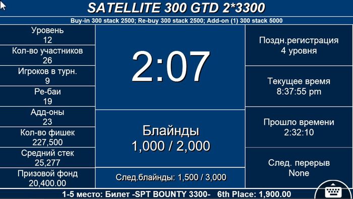 В финальную часть перешло 11 участников, все в призах, 12 место занял Михаил Симонов, выставился алл-ин 1,3М с , Виктор Левченко вколол по , на флопе положили , так и осталось, бабл лопнул.