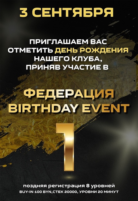 День рождения покерного клуба Федерация собрал 34 гостя! В приятной и главное веселой атмосфере мы отметили 1-й год нашей работы! Фотоотчет мероприятия будет выложен на днях, а сейчас подведем итоги турнира Birthday Event.