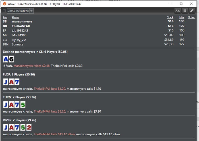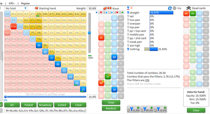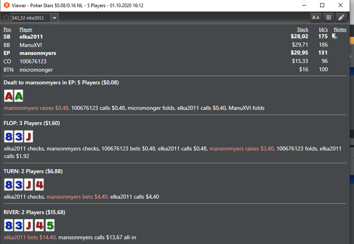 Терн не стал ставить, т.к. у него у самого есть флеши, хоть и туз их сильно поблочил но также доехали две пары, поехало фд которые может не выкинут типо KK QQ, а ривер после чека подумал могу выбить jj 1010 qq, которые вколили рейз (1010 jj не все, только с бэкдор фд и половина), в фз получилось 40% фолд эквити примерно, при необходимых 25. Не знаю вообще как насчет такую превращать в блеф, может переблеф, но по сути у нас сильный перевес по натсам, что в дипах важно наверное, по сути с 88ками мы не блочим фолды, но если посмотреть на ренж у нас там много друих есть рук для блефа типо 44ки, А3- А6 с бэкдором, 45, 56, 67 с бэкдор фд, те же натс фд. А с 88ками наверное переблеф плюс нет эквити почти. Кто что думает?