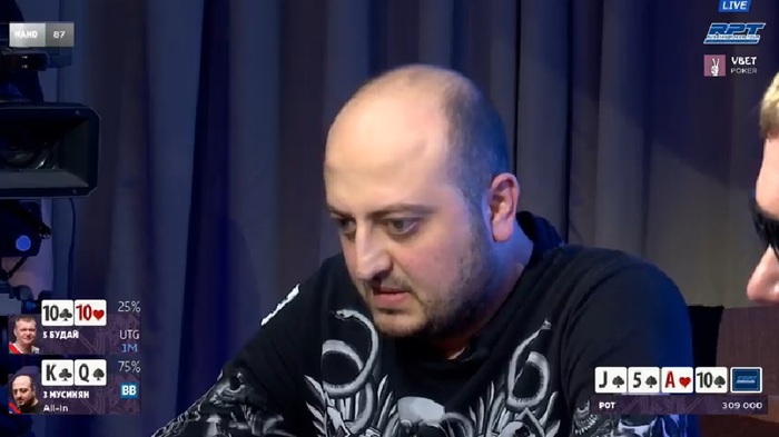 Через 15 минут вылетел Мусинян Гор в очень обидной раздаче. Выставился с против Будая Дмитрия. Флоп дал армянину гатшот, тёрн закрыл ему стрит и дал оппоненту сет, а ривер улучшил Будая до фулхауса.