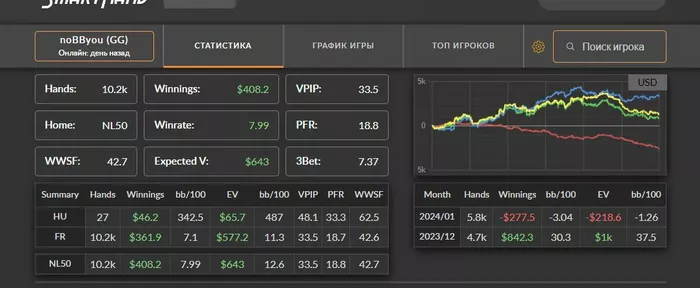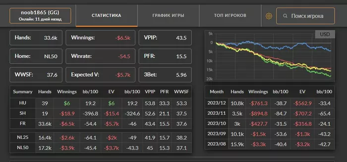 FishWhale, там полно таких примеров, когда випачи вдруг начинают играть +- нормально либо лить мало. Ну и анте столы диспа сумасшедшая. Там все что угодно может быть даже на дистанциях 50-100к рук. Тот кого ты скинул для анте столов не является супервипом, это гавнарь, который лил 10-15бб по ЕВ (без учета рэйка). Потому что рэйка он платил под 30бб. Ему достаточно было просто чуть префлоп поменять и апчик словить.