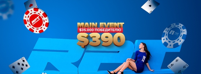 19:00 RPT MAIN EVENT (Stage 1). GTD $100.000, $35.000 победителю. Байин $90, стек 10.000, уровни по 15 минут, период поздней регистрации до 8 уровня. 20% игроков переходит в DAY1.