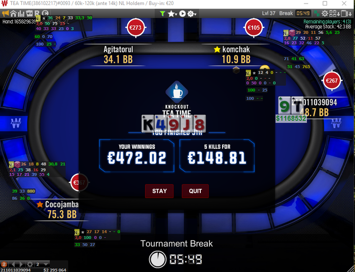 Poker Stars, $9.80 Buy-in (60/120 blinds, 18 ante) No Limit Hold'em Tournament, 9 Players Poker Tools Powered By Holdem Manager - The Ultimate Poker Software Suite.