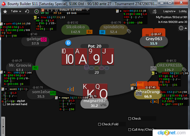 В твоей раздаче, если я правильно понимаю твой ХАД, таких тоже не имеется, а значит fEV должно быть достаточно, чтобы пушить с "шестёрками". В принципе, на предфиналке, с самым маленьким, или с самым большим стэком играю как-будто мой баббл-фактор=10 практически по чипЕВ. Так как высокое фолд-эквити и мёртвые фишки компенсируют потери по ICM при колле