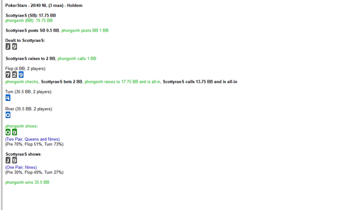 К сожалению проиграл х25... Но я даже не расстроился Раздали борд AAx у меня короли, не смог сфолдить, потом огрызок стека отдал TTvs55 пятерка на терне