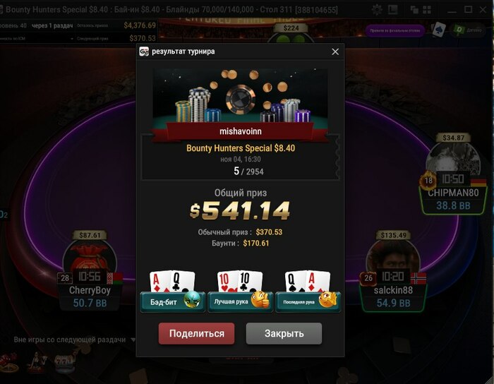 2)Хорошо сдружился с Бебишарком, был на своей первой покерной серии в оффлайне, эмоций выше крыши.