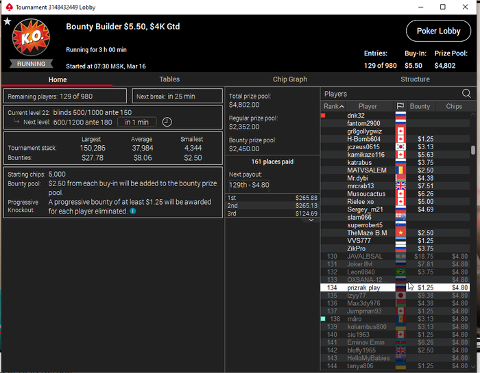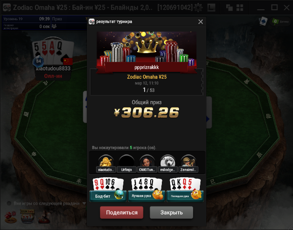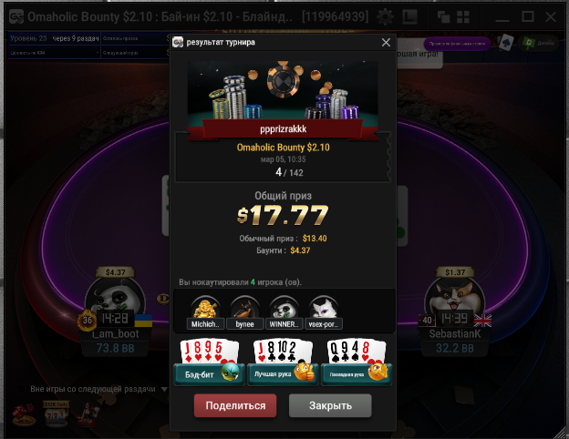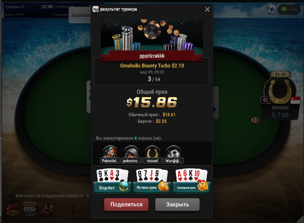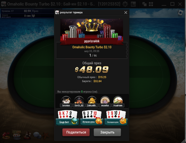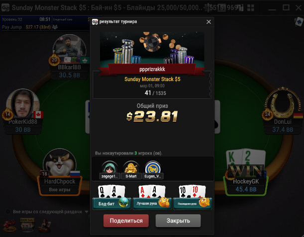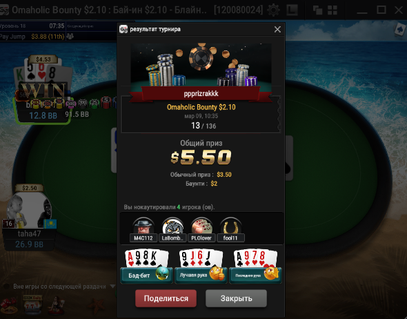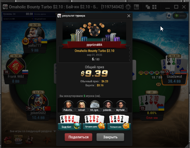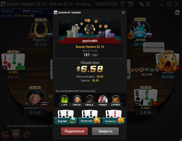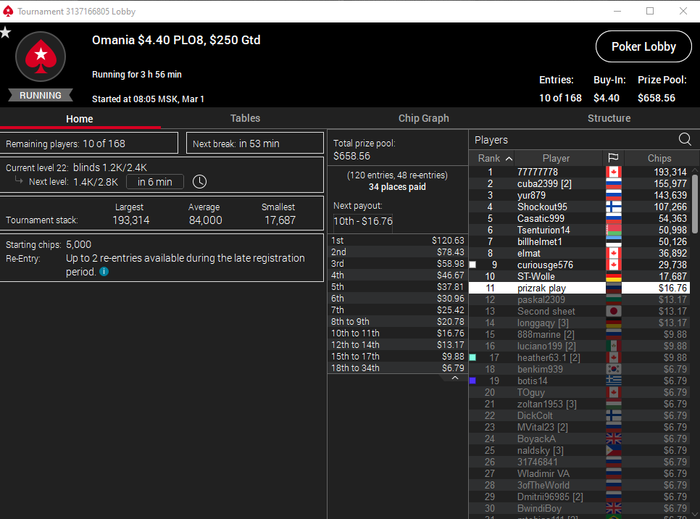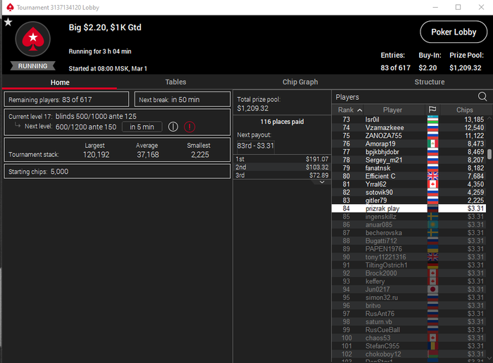 Всех приветствую господа. Сессия 163. День -112,96$. Бр 5693,99$ Неделька началась с говна, загрузил кучу турниров и как в самом страшном сне покериста абсолютно в каждом флипе меня ждало поражение, плюс даже там где я был старше очень часто загибали. Итого только 2 итм из 26 турниров, хреновое настроение и отвращение к покеру. Не знаю, возможно настало время сделать длительный перерыв для того, чтобы отдохнуть, подумать о будущем в покере, вернуть желание к игре, подтянуть другие области моей жизни. 2 месяца игры в 0 меня изрядно потрепали, стали появляться мысли о нецелесообразности дальнейшего продолжения развития, короче надо перезагрузиться и посмотреть на все с другой стороны. В любом случае меня не теряйте, как только морально восстановлюсь, обязательно вернусь к прежнему режиму. Всем удачи и по-меньше грязи!
