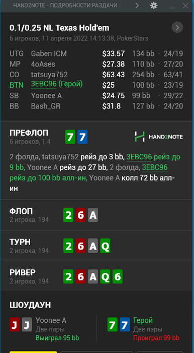 В последней взбесился и нажал колл из-за того что этот чел 3 раза подряд пушил в мой 3бет. Как видно из скрина, чуда не случилось)