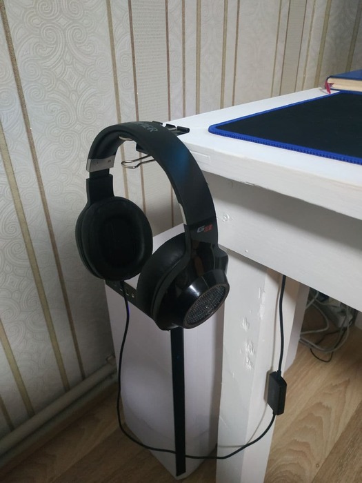 Наушники по прежнему очень радуют. Удобные и стильные, микрофон супер, звук тоже гуд. Подскавку для наушников не вижу смысла пока покупать. Спасает всё тот же канцелярский зажим) Ещё ни разу не зацепил и не опрокинул.