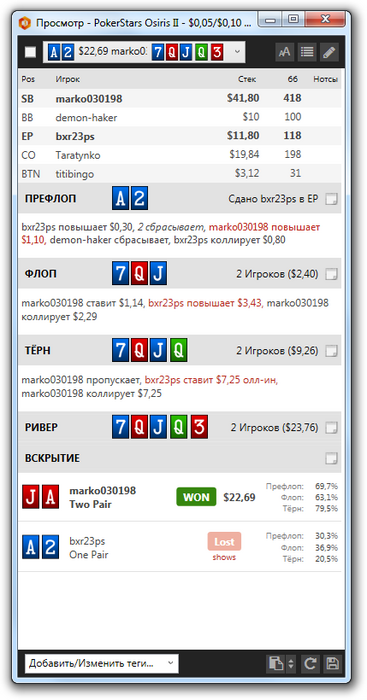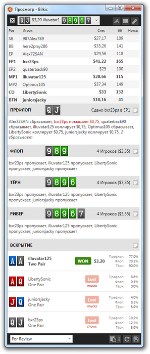 После промелькнувшей на флопе мысли о контбете (в троих!, хорошо хоть моя интуиция с диким ржанием проорала "Да ты гонишь, это уже явный перебор!") и после ШД понял, что на данный момент наверняка не вхожу в данной номинации даже в топ-100