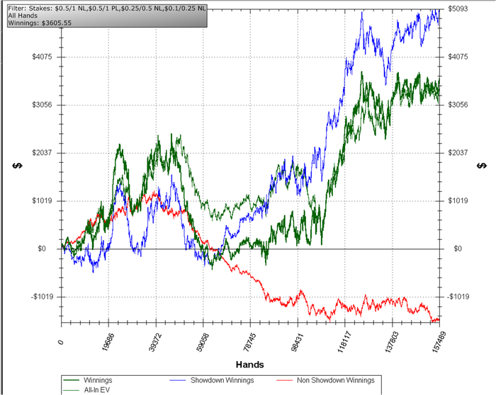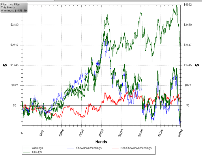 При этом по ощущениям было очень много доездов оппонента в 2-4 аута, причем часто уже на терне. WTSD 27,4% и при этом W$SD всего 48,7%. Много выставлялся на поздних улицах в минус по ев.
