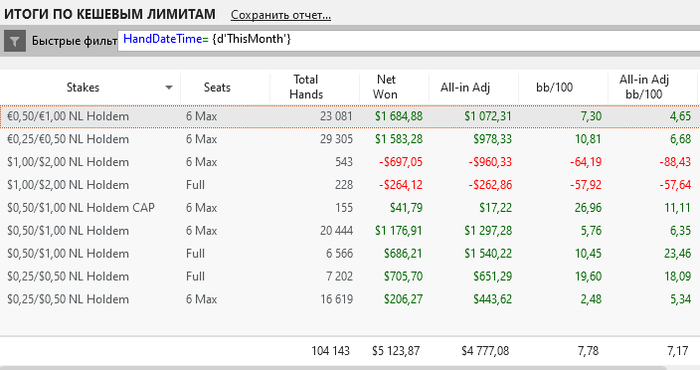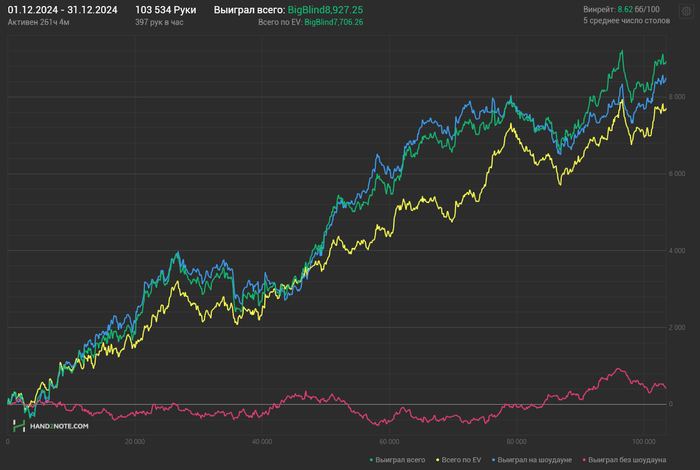 На самом деле завидовать нечему. Это своего рода компенсация того, что я пока не могу играть выше и нормально плюсовать, поэтому беру дистанцией на лимитах ниже, благо есть для этого трудоспособность. На 200-400 просто нет столько игры, чтобы такие выкатывать). Сейчас как раз работаю над теоретической базой, чтобы пробить потолок. В это году, кстати, получается играть меньше и больше плюсовать. Но вообще в идеале нужно уменьшать количество столов и повышать играемый лимит.