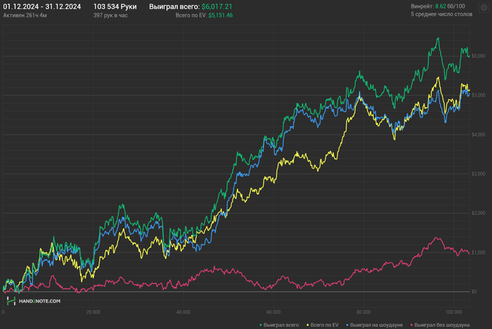 Общий доход $7363. Дистанция 104к рук, 600 рук/час (х2н неправильно считает), 175 рабочих часов. И при таком объеме все время поддерживал необходимый уровень агрессии и внимательности, красная даже в + (если не учитывать бомб-поты).