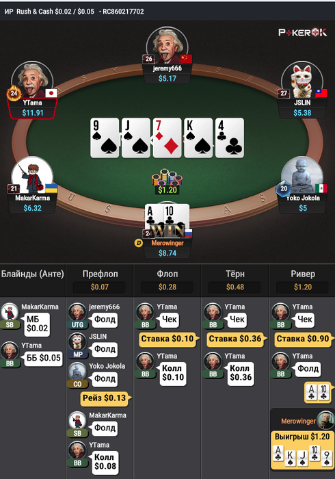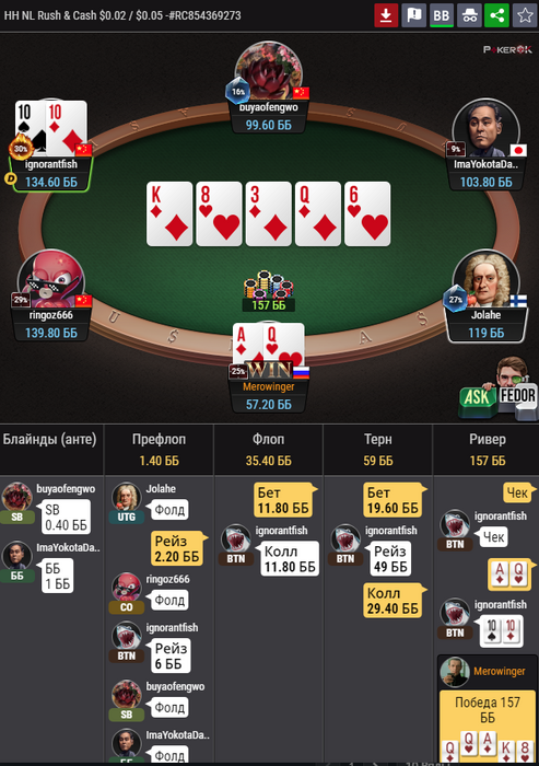 Хочется использовать позиционное преимущество, и через давление забирать банки. Также хочется играть агрессивно, чтобы создавать нужную репутацию за столом (натсы требуют оплаты). Упасть и отдать банк в целом задача не трудная)