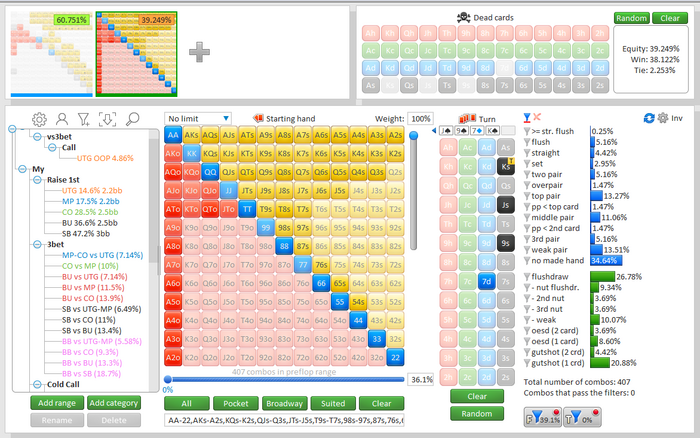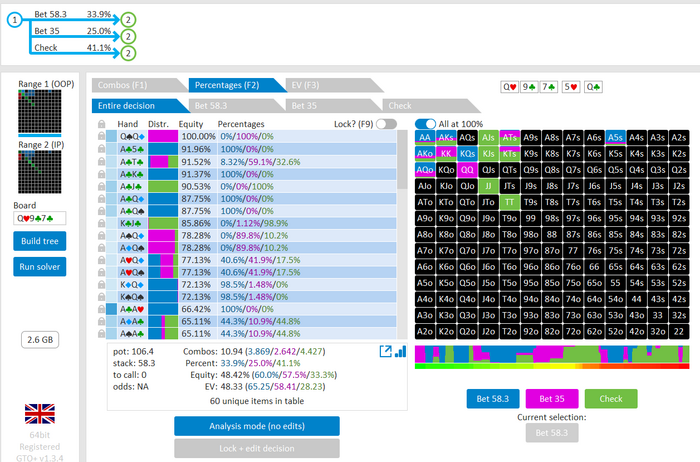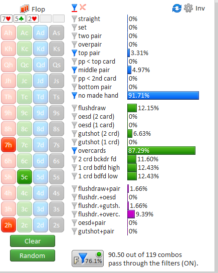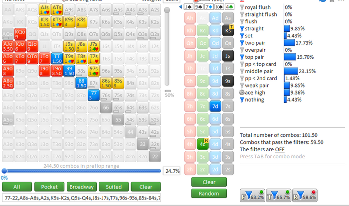Без локов, я так понимаю логику солвера, - он имеет преимущество в топе диапазона, и вместе с тем, высоким бетом выбивает очень много моего воздуха, поэтому и ставит крупно с высокой частотой.