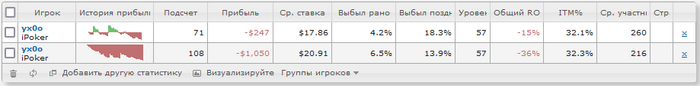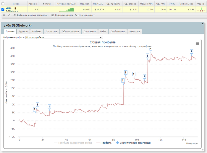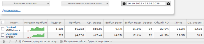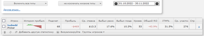 Рой -36% за 100 турниров (за всё время, нижняя строка), а если брать во внимание только те, что ты сыграл в этом году (верхняя строка), то выйдет -15%.