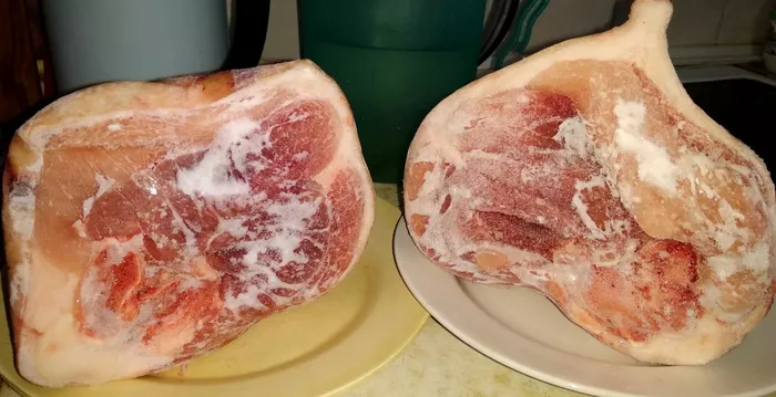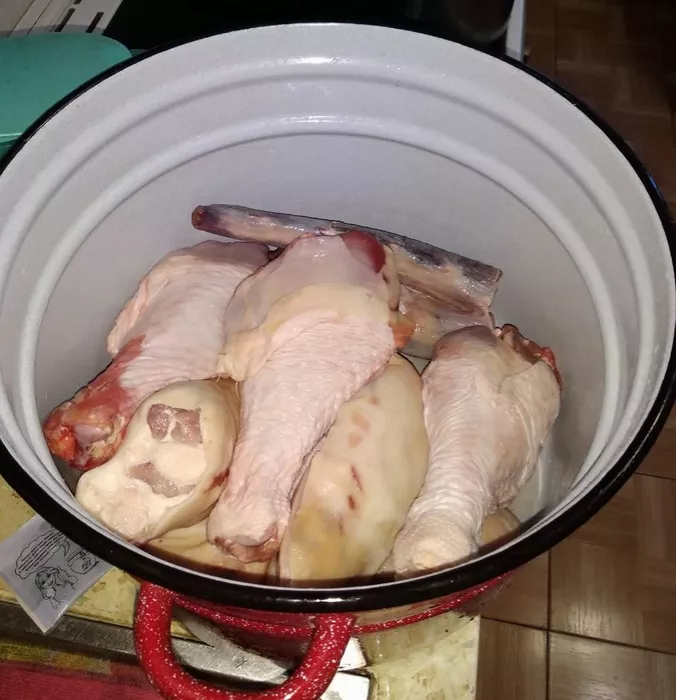 Первыми вестниками приближающегося холодца становятся свиные рульки. До вечера размораживаем, потом ставим на ночь в кастрюле с водой, чтобы убрать остатки свернувшейся крови и чтобы легче отделялась шкура.