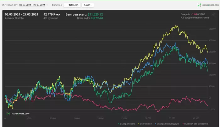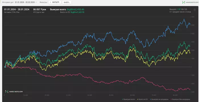 На графике видно что полетела красная, у меня всегда она была около нуля или немного ниже. Все потому что нет концентрации на всех столах и куча мелких спотов сыграно на отъебись ,не продумав все линии и раздачу в целом.