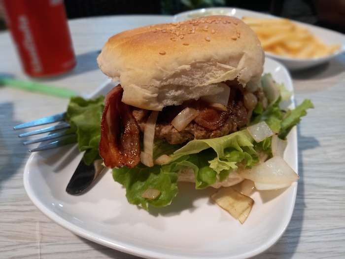 Насчёт самых вкусных очень не уверен, но бургеры неплохие. И цена норм. Бекон бургер за 75, картоха за 35 и кола за 30: