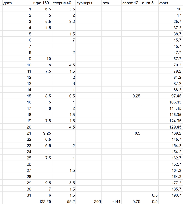 Отработал 193 часа. Отыграл 133 и 60 теории. Были дни, когда от теории просто плавился мозг, информации много новой, временами очень трудно. Забил на спорт и англ, наверстаю. Промис. Сыграл 346 туриков, в апреле было 277, заработал славные -144$