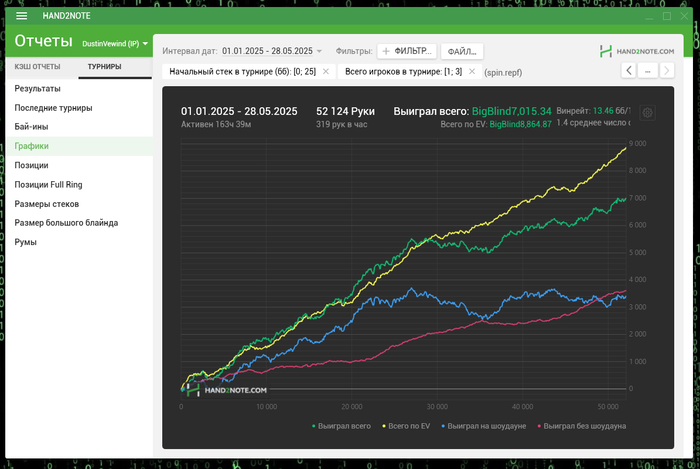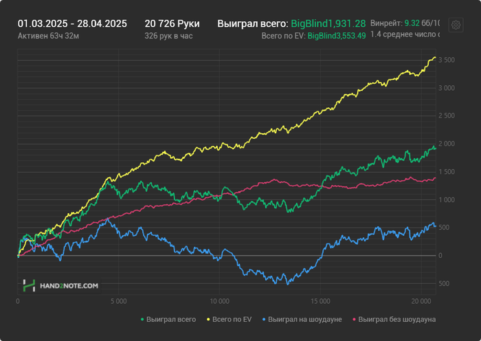 И что мы там видим? Правильно. У человека EV ровно 0, а фактический выигрыш 80бб. за 350 рук это огромный перебор.