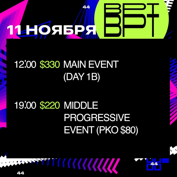 В 19:00 начнется $220 Middle progressive event. Сайд-ивент с 20-минутными уровнями и стартовым нокаутом — $80.