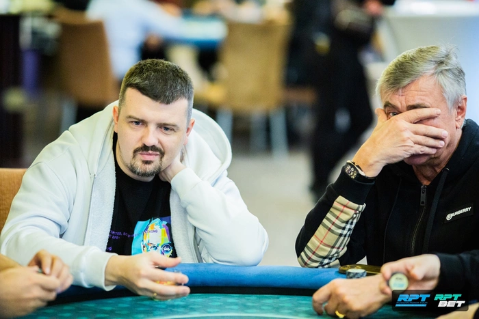 Почти одновременно с двух столов выбили Андрей Моисеев (15 место) и Владимир Воронов (14 место). Оба оставались с совсем короткими стеками: Андрей с 7бб, а Владимир с 2бб. Выплата составила по $900.