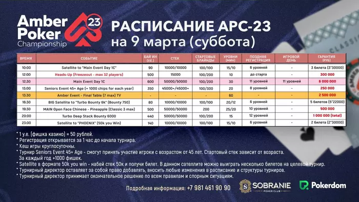 5) 13:30 турнир Amber Event - TV стол с закрытыми картами. Трансляция будет в ВК и Ютюб канале казино Собрание.