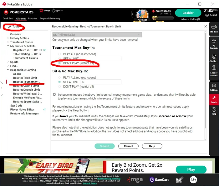 Может кто-нибудь подскажет- как на POKERSTARS ОТКЛЮЧИТЬ НАГРАДЫ БИЛЕТАМИ НА ТУРНИРЫ (не ежедневные, а именно в челенджах) ??? играю чисто кэш, а мне насыпают награды турнирными билетами, а они мне не нужны. Может есть возможность их откл-ть и получать именно кэш в награду??? У кого то в дневнике видел , но не могу вспомнить у кого и давненько это было. Спасибо!!