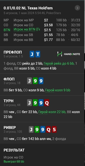Какая нахуй разница. Он стеканулся по терну поймав свой аут. На 88бб терн пуш от опп. Если оп так играет каждый раз то флоат флопа оправдан. Норм раздача сыграл в плюс ев жирно.
