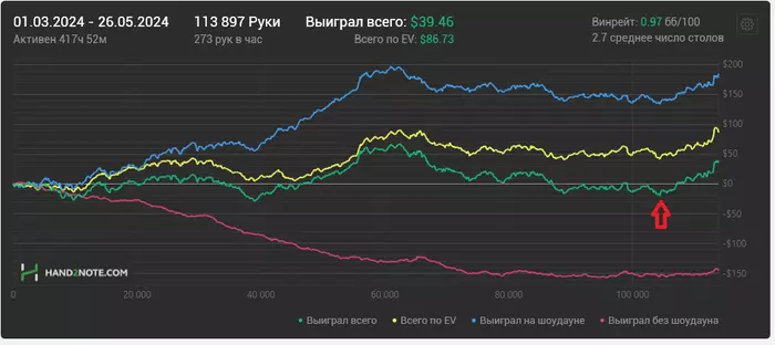 а знаете что изменилось? я просто не играл некоторое время! и так каждый раз! 10 лет уже одно и то же! да, вы говорите что зачем румам заморачиваться на микросах, они типа на рейке зарабатывают... согласен. но это что? что это тогда? я вдруг стал гением покера или что? почему после долгой паузы закрываются дро, почему у меня с раздачи стриты вдруг? почему этого всего нет потом, после 2х месяцев игры? куда все девается? и почему оно появляется после паузы? я специально такой эксперимент провел. есть комментарии, отцы?