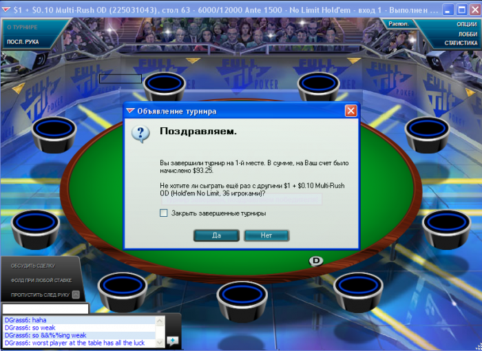 Full Tilt Poker $4 + $0.40 Rush On Demand No Limit Hold'em Tournament - t100/t200 Blinds - 9 players -