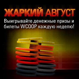 "Жаркий август" - уникальная серия турниров с низкими бай-инами, в которой разыгрывается более $170 000 и места на турнир World Championship of Online Poker (WCOOP). Выигрывайте денежные призы в ежедневных турнирах "Микро" и "Макро". Кроме того, участвуя в турнирах, Вы зарабатываете очки, а лучшие игроки по результатам недели получают дополнительные призы. В этом году серия WCOOP обещает стать крупнейшей за все время проведения, и в ее турнирах будут разыграны миллионы долларов.
