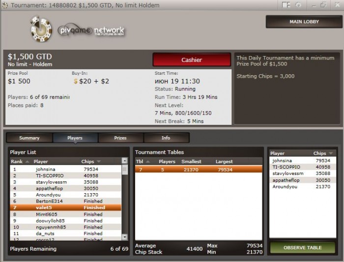 Всем привет! Играю сейчас мало. ночью сегодня сыграл всего 9 турниров, и затащил копеечку! а так за последнее время не мог даже выйти на финалку, синдром 10-17 мест просто одолел!!!