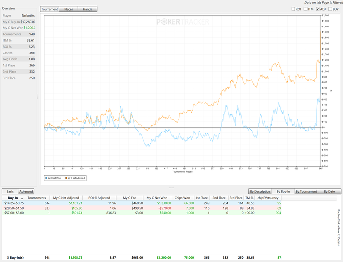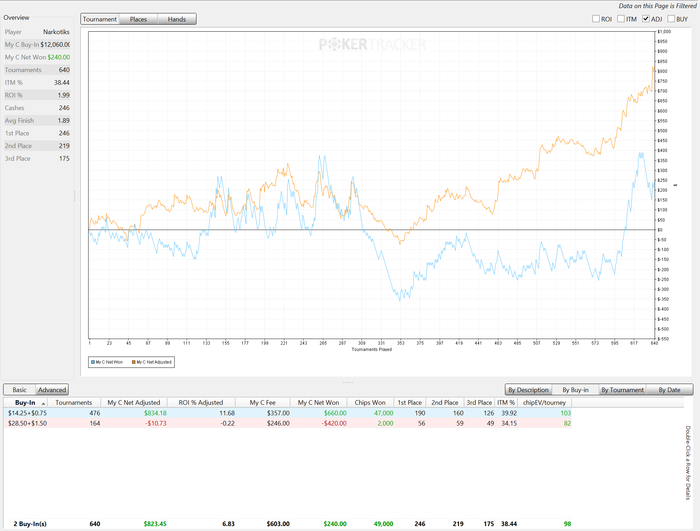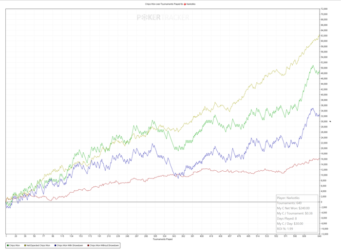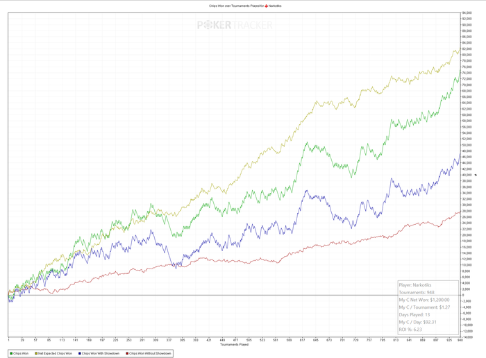 Последние пару дней играть неприятно. Как будто в башке ментальная молочная кислота. Почти физически тошнит от щелканья кнопок. Играю плохо, много тильтую. Тем не менее, вчера подобрался к 60-кам. Сегодня должен был начинать с них, сыграл 1 турнир, занес x10, сижу-тошню. По плану надо 92 турнира отыграть сегодня. Посмотрим, может на 100-ки получится посмотреть. А может и на 15-ки опять).