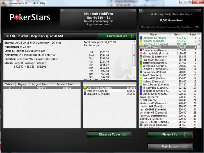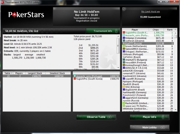 Poker Stars, $5 Buy-in (150/300 blinds, 40 ante) No Limit Hold'em Tournament, 8 Players