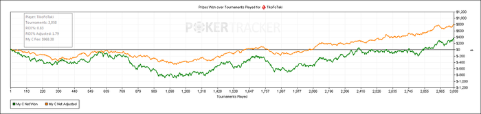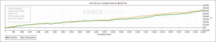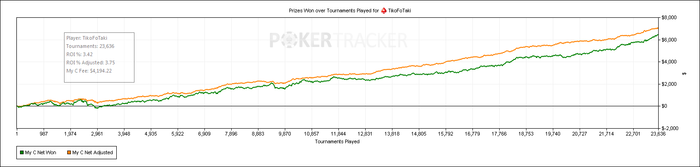 По отзывам и советам многих игроков, я пришёл к выводу, что мой агрессивный банкролл менеджмент может сыграть со мной злую шутку на 15$ лимите, так что я решил задержаться на 7ках ещё некоторое время и хорошенько приготовиться к осаде следующего. Играл я тогда в те месяцы около 3-3.5 тыс. турниров в месяц. То есть результат средний, не впечатляет, но и не мало. Первые серьёзные проблемы встретились в апреле, когда происходил полный дурдом в игре. Я просто не понимал что происходит. Я знал, что играю хорошо. Но этот стрик случился именно при переходе по лимиту. Мне было страшно. Я думал, что не умею играть. Как что чуть серьёзные оппоненты - я сразу показал свой непрофессионализм. В итоге тот месяц был самым жёстким. Как позже выяснилось, игроки там по рыбным параметрам вовсе не отличаются от рыб ниже. А отличие в том, что здесь регов уже побольше, и психология! И второе имеет на мой взгляд ключевое значение. В те дни мне действительно было скверно, я словно возненавидел покер и казалось, что никогда его не смогу больше полюбить. Но поискав материал по психологии, наткнулся, как вы уже могли догадаться, на чудо-творение Джареда Тендлера - "Покер. Игры разума". Вы даже не представляете как мне интересно было читать эту книгу. Наверное, ключевую роль в этом сыграл тот факт, что книга была не просто собранием каких-то сухих советов по преодолению страха, улучшению мотивации и т.д., а это было что-то вроде интересного рассказа автора и плавного перехода к покеру, полное разжёвывание всех проблем. Решение не самих проблем, а причин их возникновения. Всё становится понятно. Однако одного прочтения явно недостаточно. Сейчас я часто обращаюсь в тот или иной раздел при определённых проблемах по части психологии. Кстати, вторая часть, как и первая, у меня есть в бумажном переплёте, но вторую я хорошенько изучить ещё не успел, а надо бы. Отзывы радуют во всяком случае. Ну ладно, перейдём к покеру.