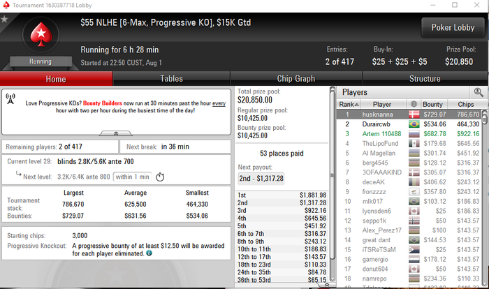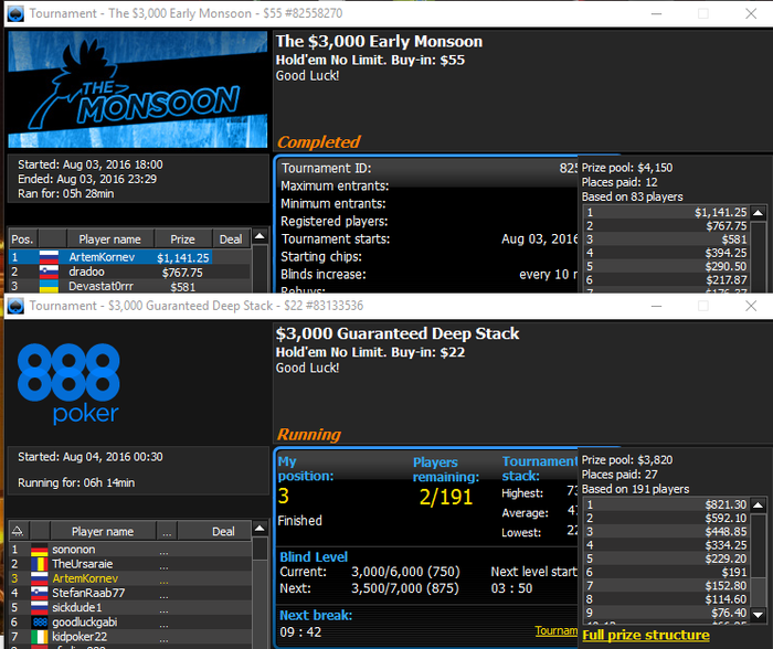 Продолжаю ждать, когда старзы разродятся заносом, а пока продолжаем собирать с 888 и пати недополученное за последние 7 месяцев.(Правда, пора б в 6макс при равных стеках тащить АВ в КВ в Монсоне, ну да ладно)