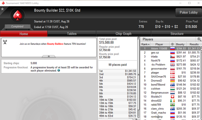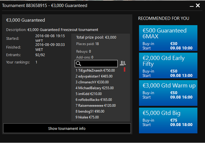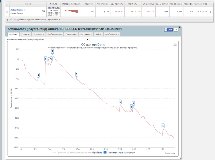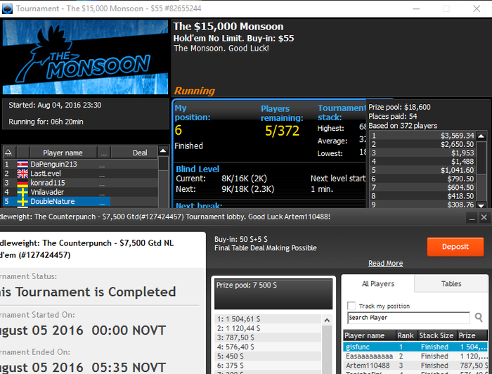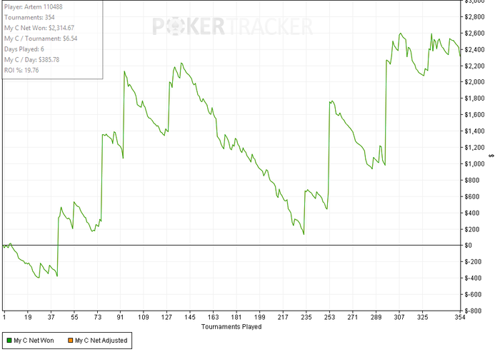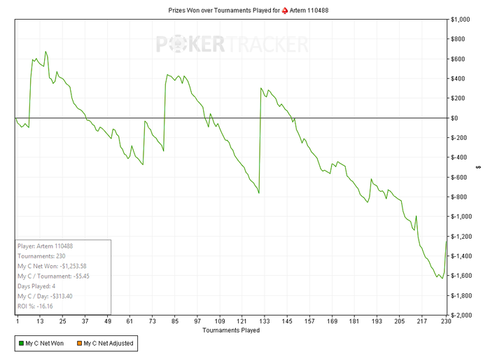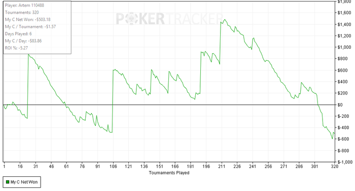 Первый раз, за долгое время отыграл 1400 турниров. Ну ладно, если убрать 100$+ турниры, то вполне себе 4300 не плохо (было бы, если бы кто-то свое эго поумерил, баран) Кол-во турниров - 5