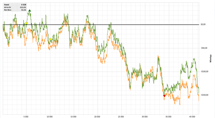 А в первой, там вообще забавная ситуация. У оппа был низкий трибет, большой цбет флопа и высокий чек фолд терна+ мы были в дипах, поэтому решил зайти. Так как такая доска ему скорее не подошла, я решил вколить флоп и попробовать забрать на терне. Когда он вколил на терне. я решил что по любому оверпара и собирался спокойно фолдить, но тут пришла эта ебучая шестерка