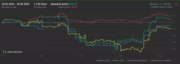 А можно не уходить в начале сесии в -5би, чисто так, для разнообразия. И в подходящие мне борды играл в фишей в позе обычную линию 1/3-1.5x-2/3 с фэ в блеф, где много чего промахнулось, или борд испортился для коллера, видел только две пары+, фолдов ровно 0 получил...