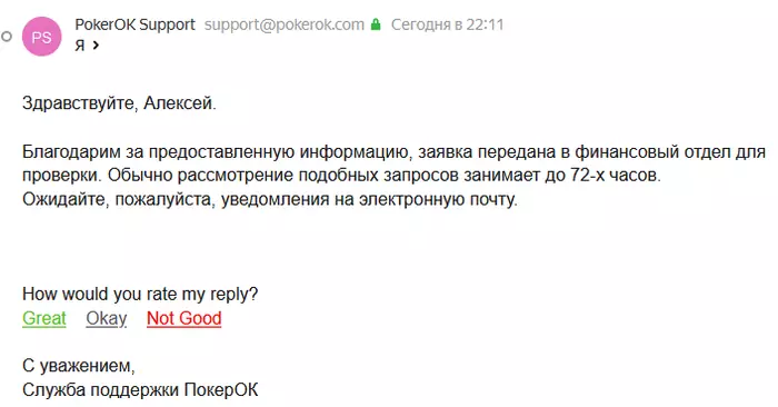 Обработав вашу заявку, ПокерОК передаст информацию платежному провайдеру. В большинстве случаев поиск платежа займет не более нескольких дней, но в редких случаях может затянуться до нескольких недель. Пожалуйста, не отправляйте повторные запросы в саппорт чаще, чем раз в несколько дней, это не ускорит процесс. Спасибо!