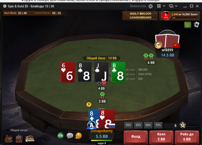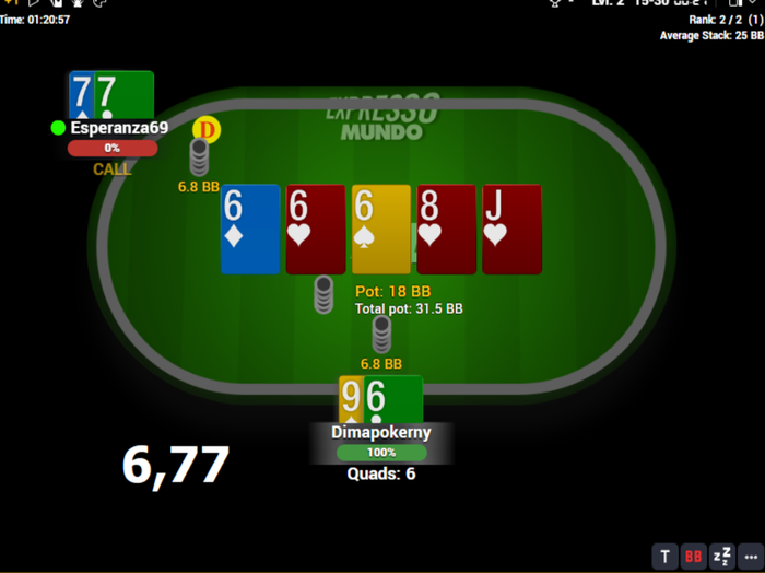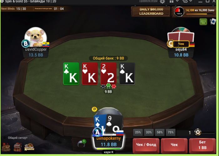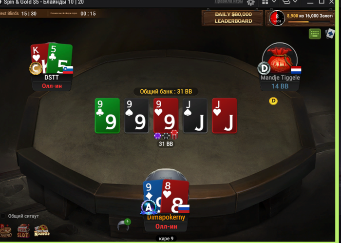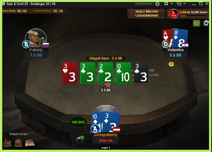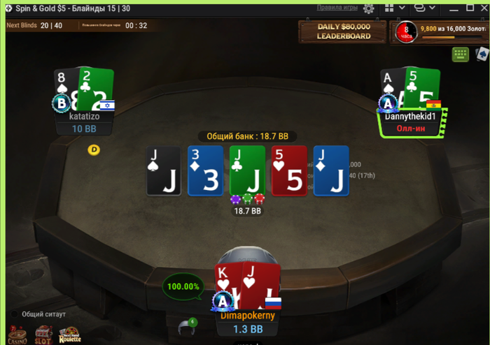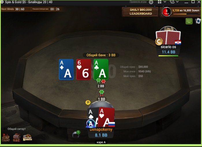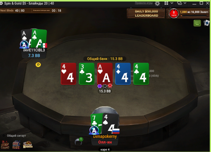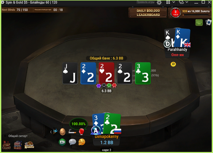 dimapokerny, Дима, я ж поучаствовала в лидерборде. Очень тяжело. Причём, как я верно заметила, мои оппоненты ушли на длительные перерывы и вернулись в конце. Четвертое место место пытался меня, нахал, выгнать из 3-го.