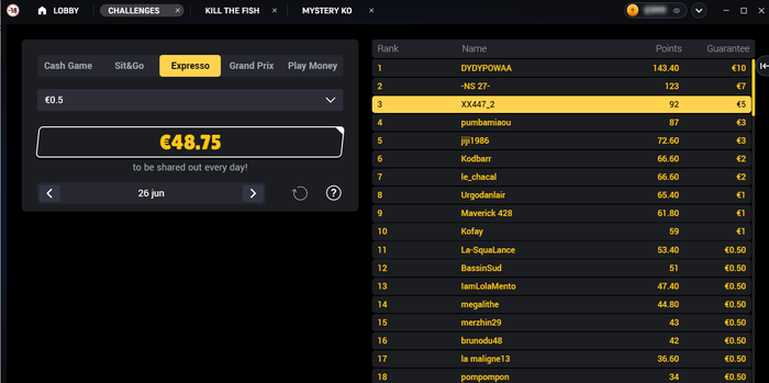 Вот к примеру то 25 число, о котором ты говоришь.которое я сыграл 280 турниров-потому что выключил и не мог уже это терпеть))) Потому что каждый день подряд такое ) Там минус 100 евро на двоечках) Откуда там баллы будут😁
