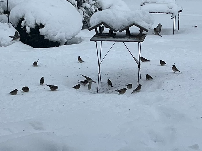 Раннее утро. Птички на завтрак прилетели. В основном снегири, но есть и синички. Судя по всему, в поселке подкармливаем птиц только мы. Сейчас им очень тяжело, когда морозы долбанули. Много скворцов уже погибло от холода. Мы их кормим, а они у нас поют, больше ни с кем рядом не поют.