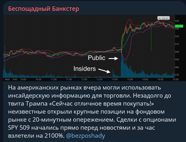 Ровно 4 часа назад после того как Трамп заявил, что сейчас отличное время для покупки, опционы колл S&P 500 ETF, $SPY со страйком $521 торговались по $0,01.