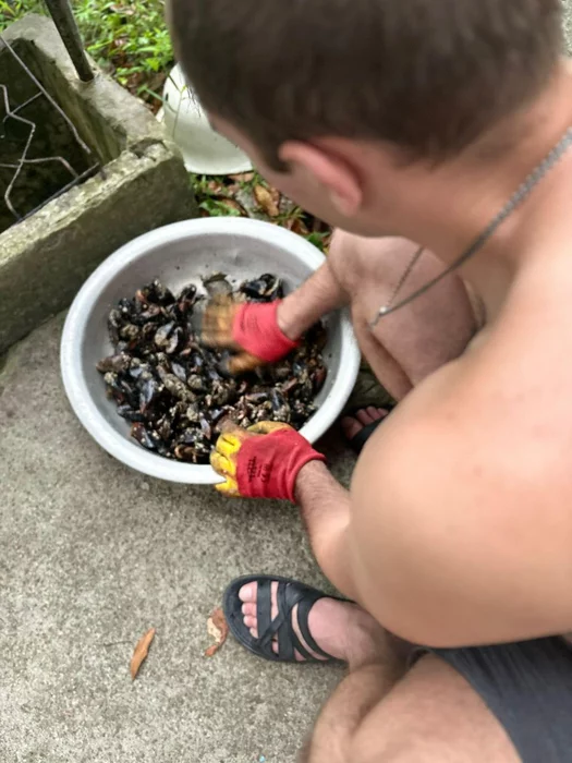 Вчера, Приехал из Краснодара практически двое суток не спал, спал прерывисто по пару часов и ехал обратно за рулем, в туапсе чувствую что уже сил нет ехать. остановился в теньке, поспал в машине минут сорок и доехал уже нормально до дома. проспал дома 12 часов. поехал в дом, а там света не было, духота и решил поехать за мидиями. Взял жилет у пацанов на пляже.перчатки, мешок уже дома взял. и поплыл)) Надергал мидий примерно 25 кг. Иду тащу до машины, и там же палатки, сувениры всякие продают. и женщина спросила че там мидии? Я говорю да. Надо? Ну отсыпал ей. Пока отсыпал дважды люди просили продать) Я говорю мне еще минимум на 5 семей раздать надо) В это же время подошел мужичок пожилой, на костылях. Начал спрашивать, что это, как едят. Разговорились с ним, сказал что переехал из Норильска, родился в ссылке, куда отправили его родителей. И после их смерти он добился того что их оправдали теперь выплачивают ему какое -то пособие. Хороший мужик. рассказывал какую рыбу они там ловили, как жили. Отсыпал ему, рассказал как готовить.