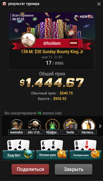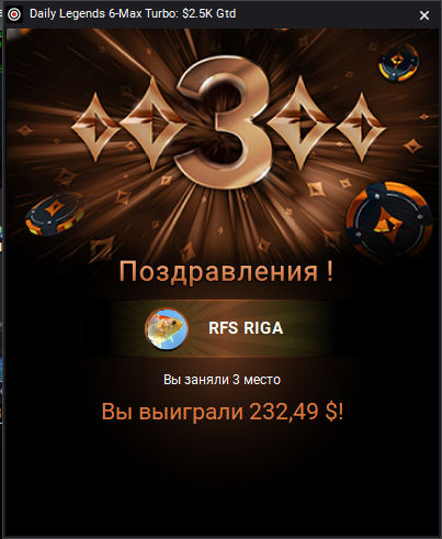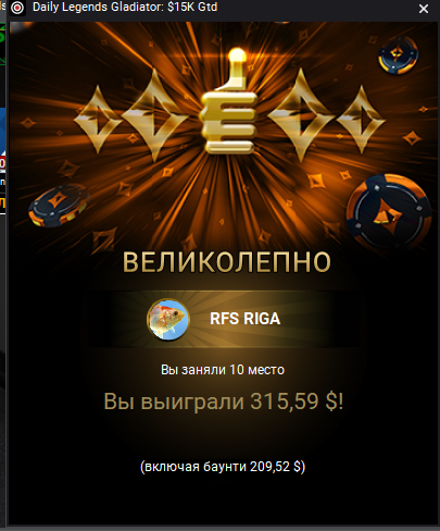 Сегодня сыграл вкаточную сессию после оффлайна. Игрой доволен, результат +1.7К. Жаль не доехал в хороших. В Гладиаторе за первое было больше 2К, не потащил КК в ВВ за чипака и баунти 65 у.е в супер сладком составе. В супер килополяне на покерке тоже было близко, там не доволен одним пасом префлоп, если бы не он сложилось бы получше. Вообще очень сильно запустил дела и нужно уже набирать форму. Чувствую огромную мотивацию ( наконец то). А ну и совсем забыл. Выиграл итоговую фриху BPL! А в общем зачете серии по итогу занял 3-е место и получил утешительный приз 700 у.е.