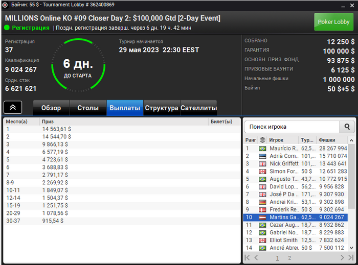 Сегодня откатал около нуля. Игрой в целом доволен, постримили хорошо) Было 3-е место в турике по 11 и прошли во второй день MILLIONS по 55, там фазы только начались, так что в финальном дне будет больше 37 человек) Проходит 15 процентов поля, так что в понедельник начнем сразу с ИТМ как я понимаю. Завтра работаю па за гульней, потом иду смотреть в живую Канада-Чехия хоккей, а дальше на фан зоне Латвия против Щвейцарии, так что если будете там то можем пересечься) НУ и если не нажрусь то по приходу домой катну лайт ночную. Всем удачи!