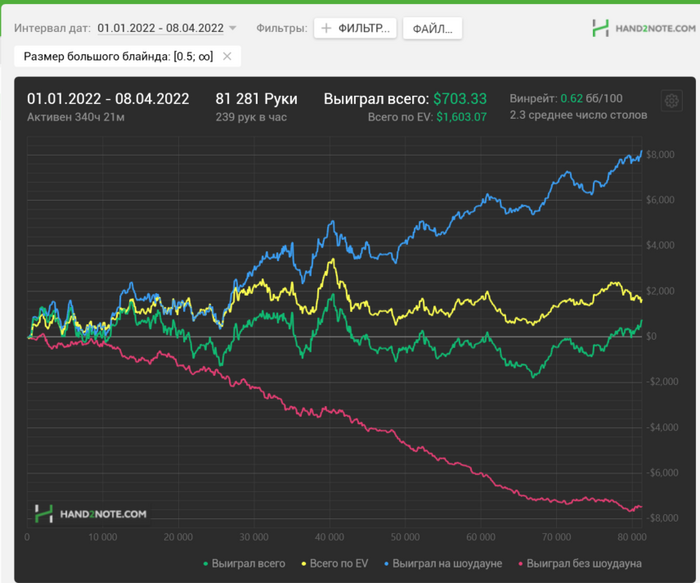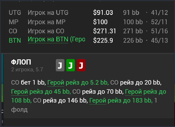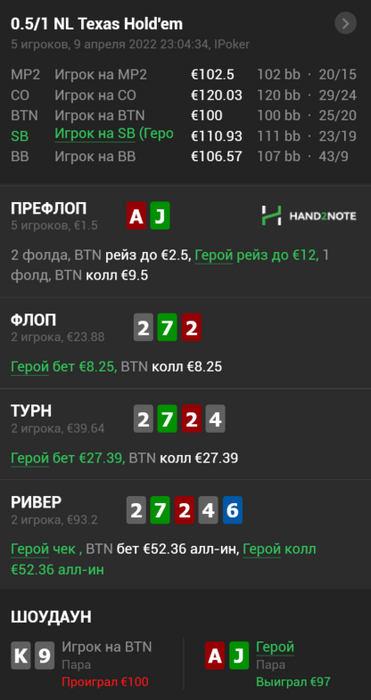 Kazrich, по флопу вроде дефолтный цбет, на терне я сам задумался во время раздачи, хочу ли я тут ставить, но подумал, что все еще выбиваю достаточно бэкдоров (хоть я их и бью, но желания переходить в чек кол не было), которые тащили флоп, ну а на ривере уже просто прикинул, что опп репит фулы и каре, которых у него от силы штук 7, а значит 3 комбы миснутых БД ФД мне будет достаточно для кола.